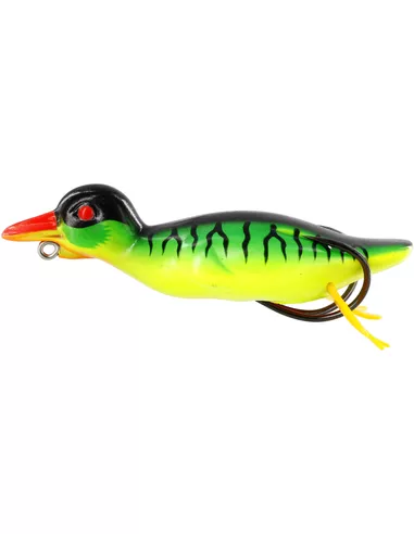 Danny the Duck in the hollow body version, the perfect weapon for big mean bass. They will go crazy for this baby duckling! Super weedless design to be fished in heavy cover. Just imagine a big bass inhaling Danny in front of you! If you twitch him, Danny will swing out 180-degrees in tight short swings and stays long on the hot-spot, fish him fast or slow, either way you can create that hopping action with a unique bubble trail just like a fleeing duckling, the beak will also add a unique front splash, don’t forget the pause! The small soft feets adds extra attraction fluttering below the surface. This is such a cool and fun lure to fish with. Thanks to the hollow body Danny will collapse around the double-hook with high hook up ratio. Nasty predators are waiting for soft Danny, dead or alive! Quack quack!